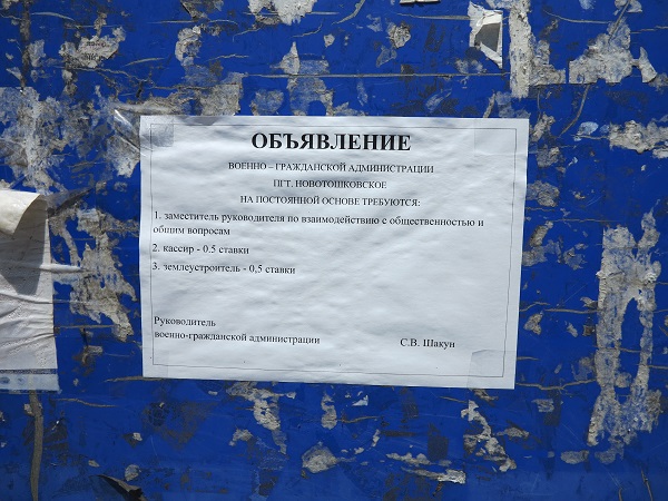 В Новотошковку мы приехали в одной машине с главой военно-гражданской администрации поселка Сергеем Шакуном, известным в Луганске предпринимателем, одним из спикеров Луганского Евромайдана. Администрация еще окончательно не сформирована. Люди как-то не рвутся на передний край, так что даже замов приходится искать с помощью таких вот объявлений: