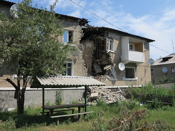 Даже в здании администрации большинство окон выбито. А торговый комплекс, что когда-то стоял напротив барака ВГА, разрушен полностью.