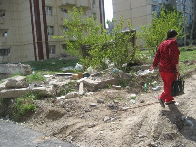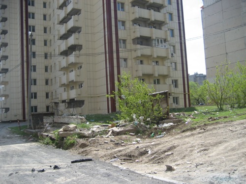 С другой стороны дороги - частная высотка, которая достроилась 5 лет назад, но свой строительный мусор, в том числе туалет, так и не убрала...