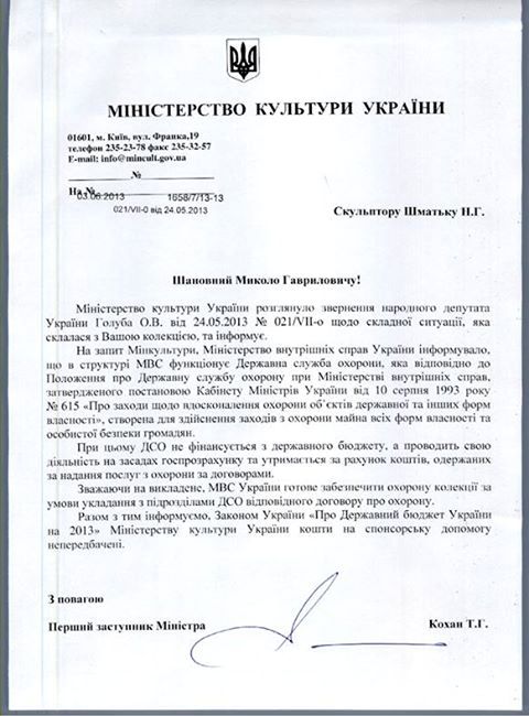 «Зважаючи на викладене, МВС України готове забезпечити охорону колекції за умови укладання з підрозділами ДСО відповідного договору про охорону», - говорится в письме.