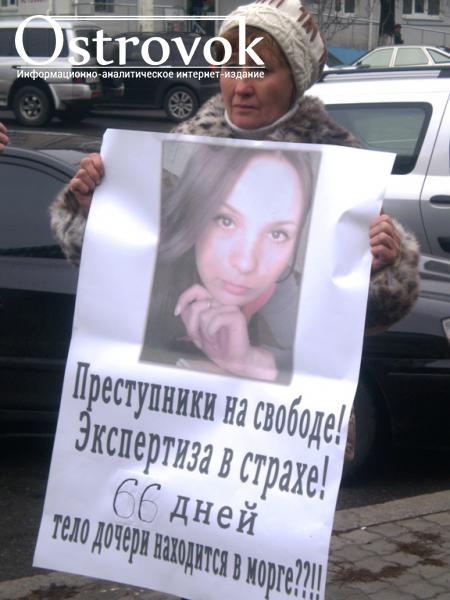 Митингующие заявили, что «преступник, убивший девушку до сих пор на свободе». Они держали плакаты с надписями «Слепое правосудие, глухой прокурор», «Преступники на свободе! Экспертиза в страхе! 66 дней тело дочери находится в морге».