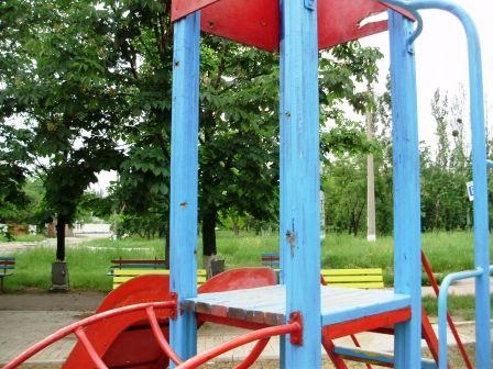 ФОТО 05. Конструкция детской площадки возле магазина «Парус» усечена осколками.