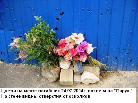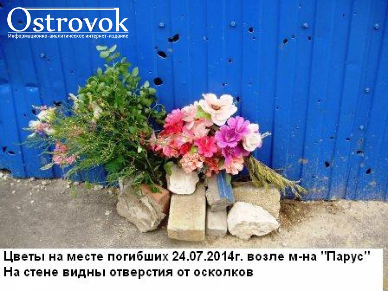 Жена погибшего Пяткова Ольга Яковлевна волнуясь, поведала следующее: «24 июля 2014 г. мой муж, находясь с дочкой 16-ти лет между магазином «Парус» и детской площадкой, попал под артобстрел. В момент обстрела –закрыл своим телом дочь. Он ее накрыл собой и держал руками крепко и только от болевого шока отпустил, она высвободилась из его объятий и прибежала к нам под обстрелом в подвал дома №22 и сообщила, что папа убит».