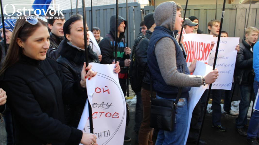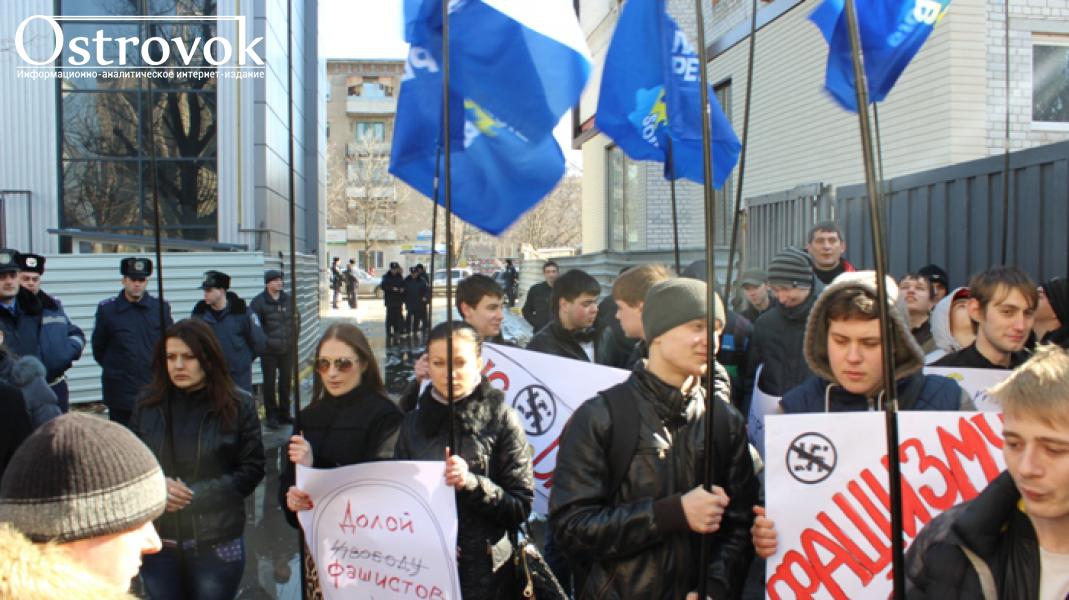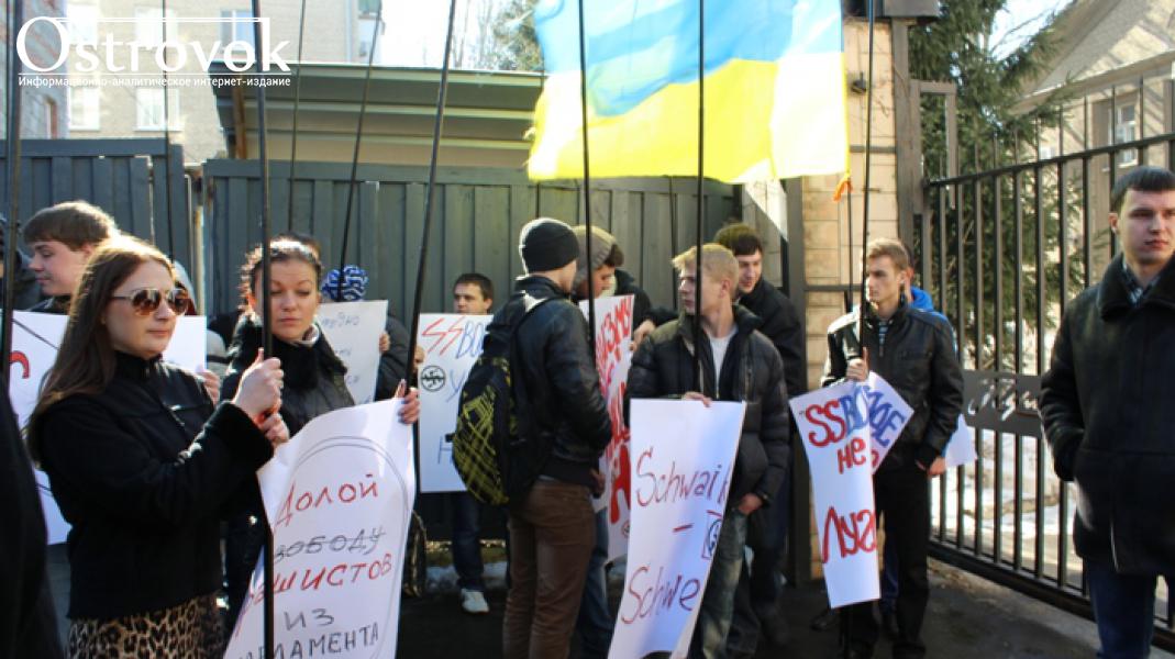 Акцию протеста против ВО «Свобода» и фашизма в связи с пресс-конференцией нардепа Игоря Швайки на телеканале ЛОТ провели представители Луганской областной молодежной организации «Молодые регионы». Об этом сообщает корреспондент Ostrovok.