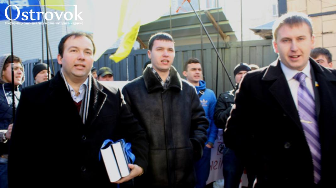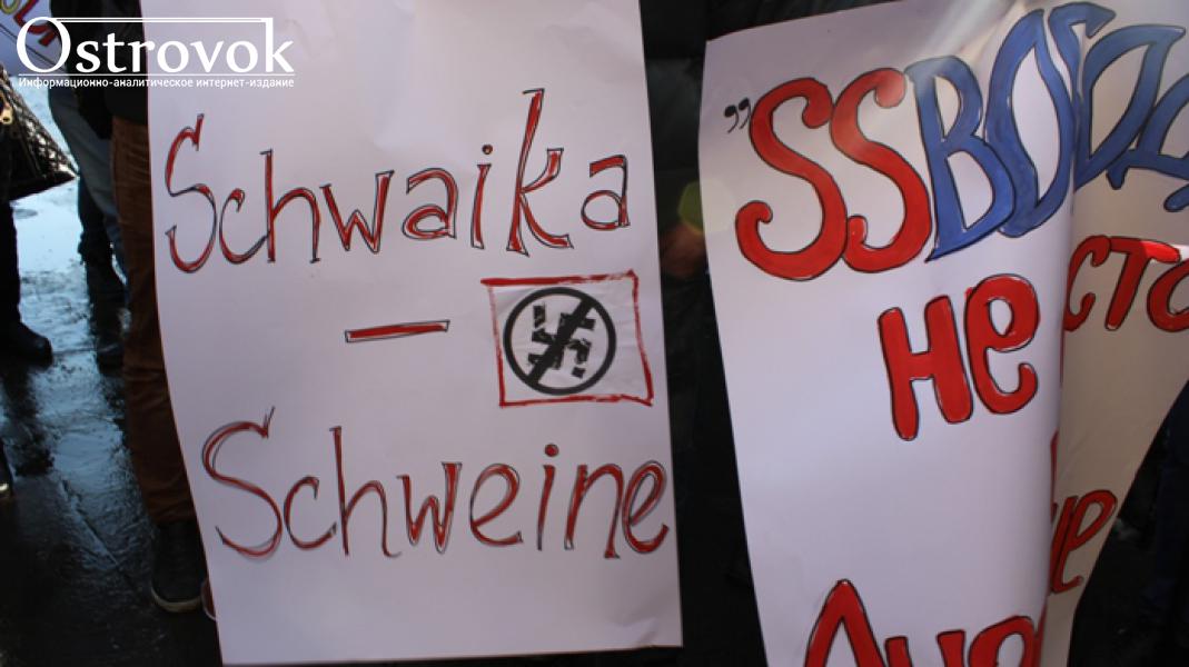 Активисты «Молодых регионов» скандировали «Фашизм не пройдет», «Свобода – нацисты», «Швайка – трус», «Свобода прочь с Луганщины», после чего разбросали фото председателя ВО «Свобода» Олега Тягнибока и растоптали их.