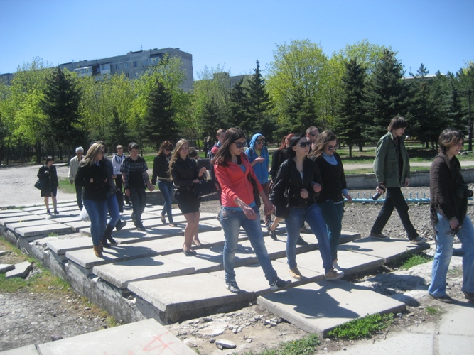 Далее в сопровождении журналистов телеканалов ТРК Украина и 1+1 наша группа отправилась в сквер Памяти, на территории которого в прошлом было кладбище и некоторые захоронения так и остались на этом месте.Здесь мы преодолели по каменным плитам то, что осталось от ранее прекрасного фонтана, проходя по которому можно было поймать брызги воды и увидеть радугу (в детстве мне посчастливилось застать фонтан работающим). Ярослав Минкин предложил нам с закрытыми глазами пробежать по плитам и представить, что с обеих сторон фонтанирует вода. Но проделать это было опасно для жизни из-за ям между плитами и их шаткого положения. В сквере Памяти мы остановились возле Памятника жертвам сталинских репрессий, где Константин Скоркин рассказал нам об этом времени и массовых расстрелах (причинами которых были социальные, этнические, религиозные различия людей и не только).