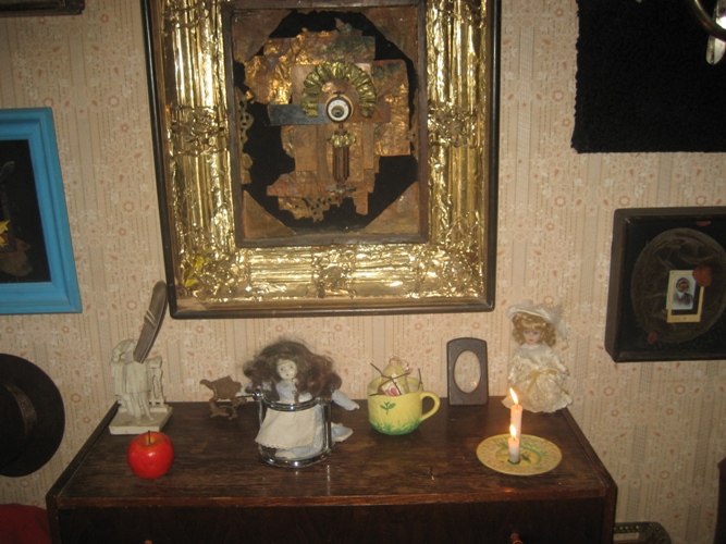 Пройдя к последнему подъезду нужного дома, поднявшись на последний этаж и войдя в последнюю квартиру на этаже, мы так же виртуозно, как и в маршрутке, начали размещаться в маленькой квартирке. В первой комнате мы увидели коллажи Валерия, в которых наряду с другими предметами преобладали куклы, пупсы, маски. Возможно, для кого-то использование пупсов в коллажах в самых разнообразных вариантах (отдельные части тела, проколотые пупсы, пупсы с механизмами, с зарисованными глазами) показалось чем-то леденящим, но мне атмосфера квартиры-музея говорила совершенно об ином.