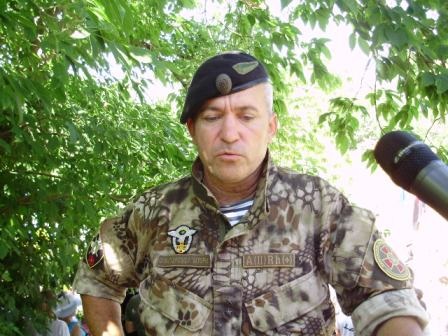 Пока известные и не очень известные в Лисичанске лица произносили торжественные речи, и Священнослужитель - иэрей УПЦ КП Андрей Чмель, он же капеллан батальона «Донбасс» правил службу по погибшим, немножко в стороне один из центральных каналов брал интервью у бойца, который был участником лисичанских событий годичной давности.
