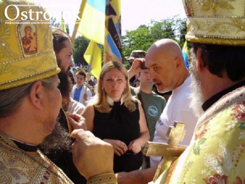Но когда ведущая объявила молебен, который проведут Священнослужители местных епархий УПЦ Московского Патриархата г. Лисичанска, Приволья, Новодружевска в воздухе повисла напряженная пауза. Народ начал переглядываться, прашивать: «А почему вместе с ними нет капеллана?». Присутствующие начали скандировать: «Ка-пел-ла-на! Ка-пел-ла-на!» Резонанс усиливался. На подиум к священнослужителям рванулись общественники и бойцы батальона «Айдар». На сцене началась словесная перепалка. Однако инициативу удалось взять в свои руки губернатору.
