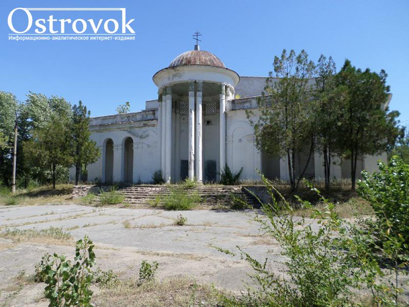Летний кинотеатр, хотя и предполагает легкость конструкций, на деле – строение довольно-таки монументальное. Купол на входе поддерживают колонны с капителями коринфского ордера, стены с соответствующей орнаментикой. Сваренный на скорую руку восьмиконечный крест на куполе свидетельствует о том, что на здание уже наложила лапу попы. Печально…
