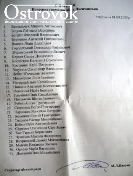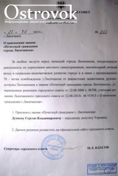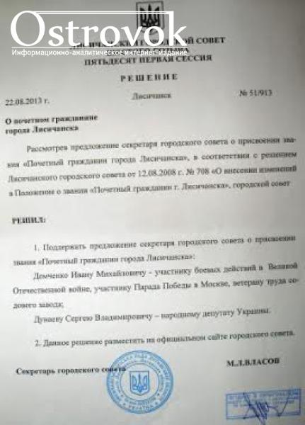 «Рассмотрев предложения секретаря городского совета о присвоении звания «Почетный гражданин города Лисичанска», в соответствии с решением Лисичанского городского совета от 12.08.2008г. №708 «О внесении изменений в Положение о звании «Почетный гражданин города Лисичанска», городской совет РЕШИЛ: 1. Поддержать предложение секретаря городского совета о присвоении звания «Почетный гражданин города Лисичанска»: Демченко Ивану Михайловичу- участнику боевых действий в Великой Отечественной войне, участнику Парада Победы в Москве, ветерану труда содового завода; Дунаеву Сергею Владимировичу- народному депутату Украины. 2. Данное решение разместить на официальном сайте городского совета. Секретарь Лисичанского городского совета Михаил Власов».