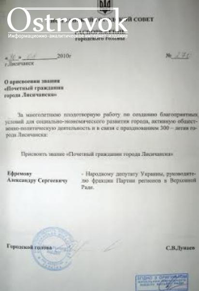 Вышеназванное решение было подкреплено и Распоряжением городского головы №262 от 27.08.2013г. «О присвоении звания «Почетный гражданин города Лисичанска»»: «За особые заслуги перед громадой Лисичанска, плодотворную деятельность по укреплению местного самоуправления, значительный личный вклад в социально- экономическое развитие города и в связи с празднованием 70-летия освобождения г.Лисичанска от фашистских захватчиков, руководствуясь Положением о звании «Почетный гражданин города Лисичанска», утвержденным решением городского совета от 12.08.2008г. №708, учитывая решение Лисичанского городского совета от 22.08.2013г. №51/913 «О почетном гражданине г.Лисичанска»: 1. Присвоить звание «Почетный гражданин г. Лисичанска» Дунаеву Сергею Владимировичу- народному депутату Украины. Секретарь Лисичанского городского совета Михаил Власов».