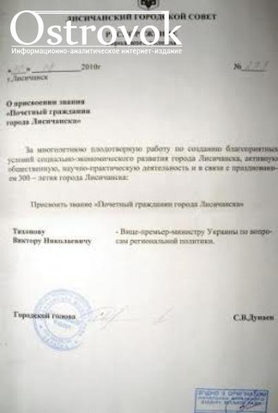 3. Тихонову В.Н., вице-премьер-министру Украины по вопросам региональной политики - «За многолетнюю плодотворную работу по созданию благоприятных условий социально-экономического развития города Лисичанска, активную общественную, научно-практическую деятельность и в связи с празднованием 300-летия города Лисичанска».