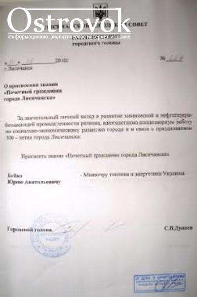 1. Бойко Ю.А., министру топлива и энергетики Украины - «За значительный личный вклад в развитие химической и нефтеперерабатывающей промышленности региона, многолетнюю плодотворную работу по социально- экономическому развитию города и в связи с празднованием 300-летия города Лисичанска»;