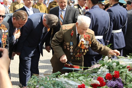 Праздничный кортеж раритетных автомобилей отправился по маршруту вдоль непрерывной ленты. Следующей его остановкой была площадь Героев Великой Отечественной войны, где были возложены цветы к Пилону Славы и Могиле Неизвестного солдата. Далее кортеж прибыл к Памятнику воинам-освободителям.