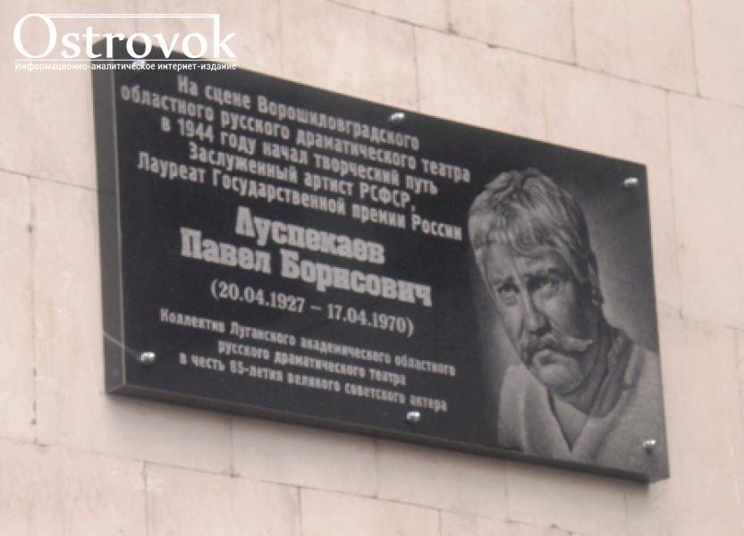 Мемориальную доску Павлу Луспекаеву в честь 85-летия со дня его рождения открыли 20 апреля на здании Луганского академического областного русского драмтеатра. Об этом сообщает корреспондент «Остров Лугань».