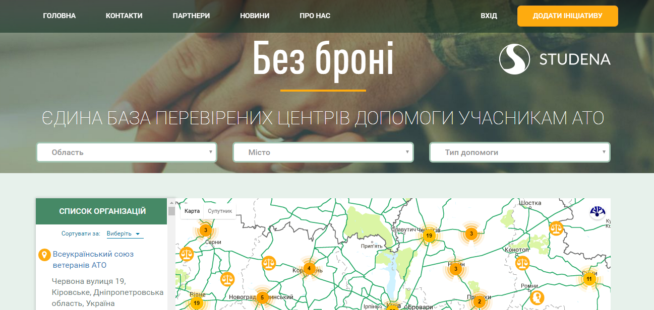 Проект громадської організації «STUDENA» прагне створити єдину базу даних усіх ініціатив, впроваджених для надання юридичної, психологічної та медичної допомоги бійцям АТО. Інтерактивна мапа України дозволить швидко й легко знайти найближчу організацію, що підтримує фронтовиків у будь-якому регіоні.