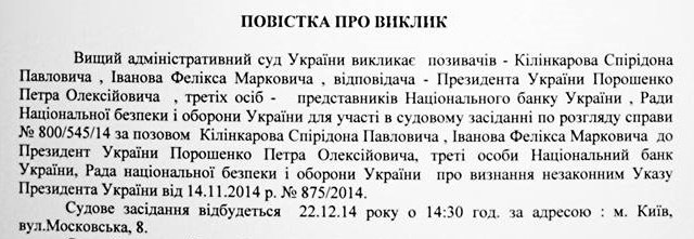 «При том, что Президентом не исполнено предписание суда в соответствии с Законодательством Украины - не опубликовано объявление об обжаловании своего Указа, так еще и процедура затягивается: вместо положенного срока - месяц на рассмотрение иска, через месяц, 21 января 2015 года, только состоится следующее заседание суда. Представители Президента мотивируют это приближающимися праздниками в стране», - заявил Килинкаров.