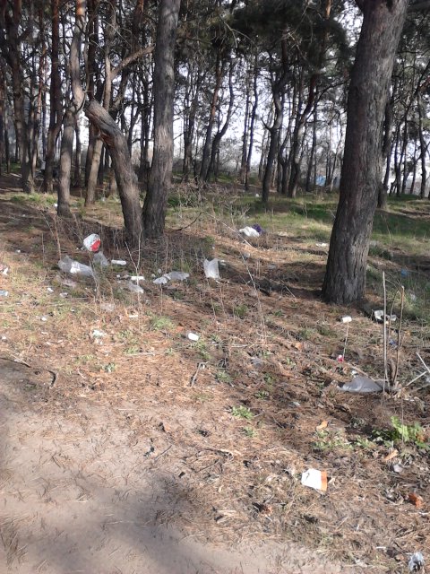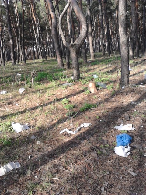 В Старобельске есть любимое место отдыха горожан, которое они называют "Сосна". Там гуляют молодые мамы с колясками, там любят прогуливаться и другие граждане, дыша фитонцидами. Но хвойная подстилка покрыта отвратительными продуктами жизнедеятельности, которые ветер унес и разбросал из мусорных контейнеров.