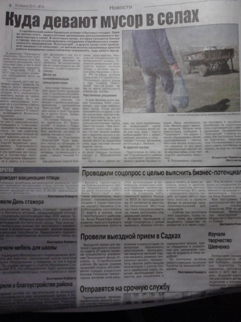 Старобельская "Телегазета" (№14) опубликовала статью "Куда девают мусор в селах". Там говорится: "Практически во всех селах Старобельского района не существует централизованного вывоза бытовых отходов. Леса, лесополосы, поля, обочины дорог завалены мусором. Жители села Новоселовка сообщили в "Телегазету", что рядом с селом образовалась несанкционированная свалка. Местный житель возмущен, что недалеко от его дома он периодически находит тела мертвых собак, и ему приходится закапывать животны".