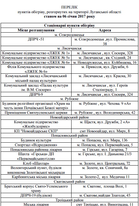 По одному мобильному пункту обогрева расположено в городах Северодонецк и Рубежное, а также в Новоайдарском, Новопсковском, Сватовском, Станично-Луганском, Меловском и Беловодском районах.