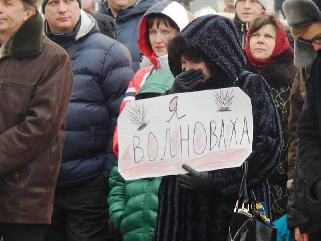 Участники мероприятия прошли по улицам города под украинскими флагами с символикой и плакатами с надписями «Я - Волноваха».