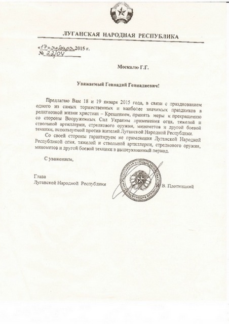 Так, глава «ЛНР» Игорь Плотницкий направил председателю Луганской облгосадминистрации Геннадию Москалю факсограмму с предложением прекратить огонь на период праздника, гарантируя огневую тишину со своей стороны.