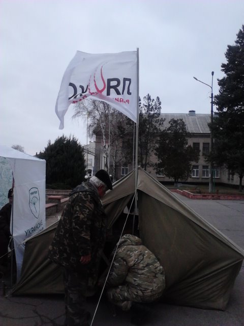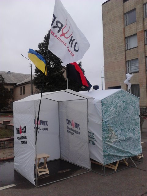 В Старобельске уже шестой день стоит местный «майдан». На центральной площади возле здания районной администрации установлены палатки с символикой «Укропа» и Радикальной партии Олега Ляшко, над палатками под порывами холодного ветра трепещут разнообразные знамена – государственный флаг, белая материя с красными вилами, черно-красный флаг, синее полотнище «Айдара» с надписью: с «З нами Бог». Рядом находятся шесть – семь человек. На 14 часов назначено второе «народное вече». Об этом сообщает корреспондент «Ostrovok».