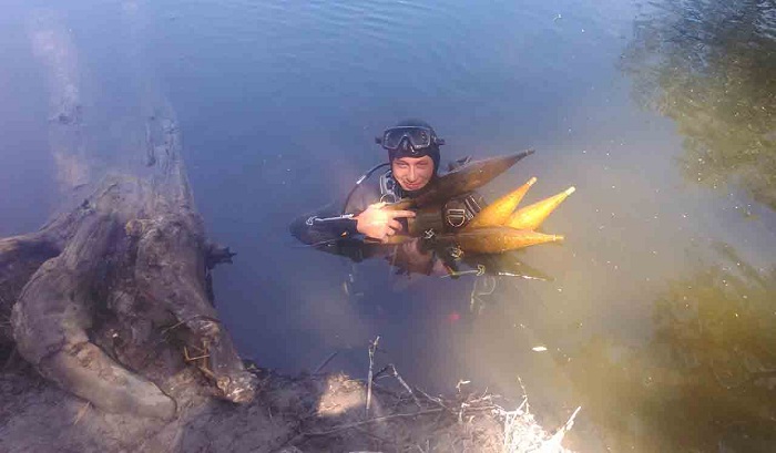 Так, по информации источника, всего с реки Айдар было поднято на поверхность следующие взрывоопасные предметы: граната РГД - 5 - 45 шт., граната ф - 1 - 41 шт., ВОГ - 2 шт., взрыватель РГМ - 56 шт., выстрел РПГ-6 шт., взрыватель В429 - 16 шт., зажигательная трубка - 10 шт., гранатомет РПГ - 22 - 1 шт., запалы УЗРГМ - 60 шт., патроны калибром 7,62 - 2,5 тысячи шт., калибром 14,5 - 77 шт.