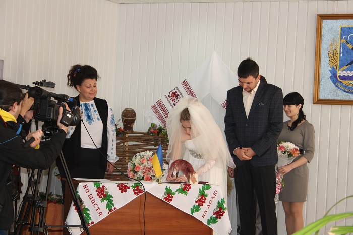 В субботу, 8 апреля начальник Главного территориального управления юстиции в Луганской области Татьяна Филатова и председатель Луганской облгосадминистрации Юрий Гарбуз приняли участие в торжественной церемонии бракосочетания первых трех пар в рамках пилотного проекта Министерства юстиции Украины "Брак за сутки".
