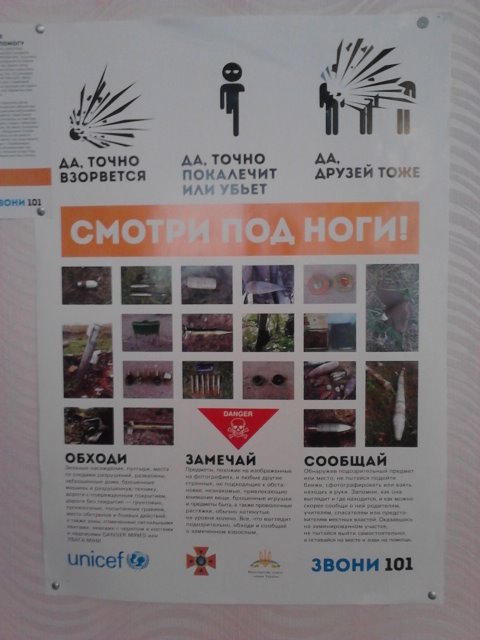 Сейчас на линии разграничения в основном тихо. А в классах висят плакаты, информирующие об опасности мин.
