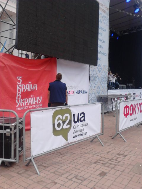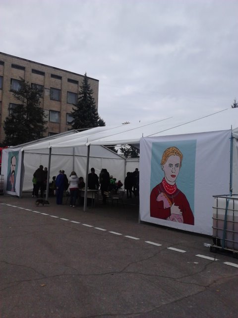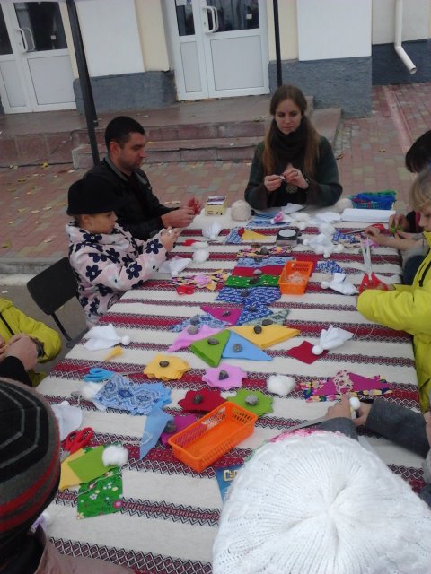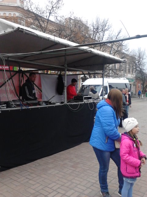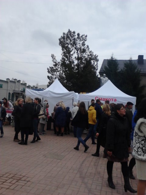 Возле районного ДК сцена, на которой выступают местные молодые таланты. По периметру площади стоят палатки и просто столы. На одних столах - изделия народных мастеров, за другими группы детей занимаются изготовлением поделок. Стоит очередь в передвижную библиотеку. Местные активисты НГО тоже имеют свою площадку для общения.
