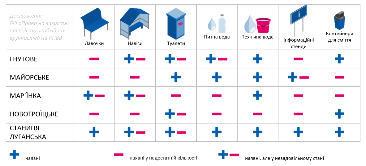 Так, правозахисники провели моніторинг наявності необхідних зручностей, які впливають на умови очікування на КПВВ: лавочки, навіси, туалети, питна вода, технічна вода .А також інформаційні стенди, контейнери для сміття .