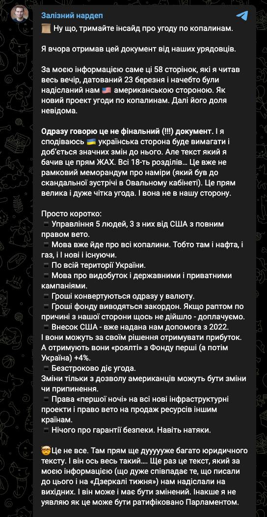 Нардеп Ярослав Железняк прокоментував текст проекта нової "ресурсної угоди" , датованої 23 березня, між США та Україною, яка патрапила йому в руки