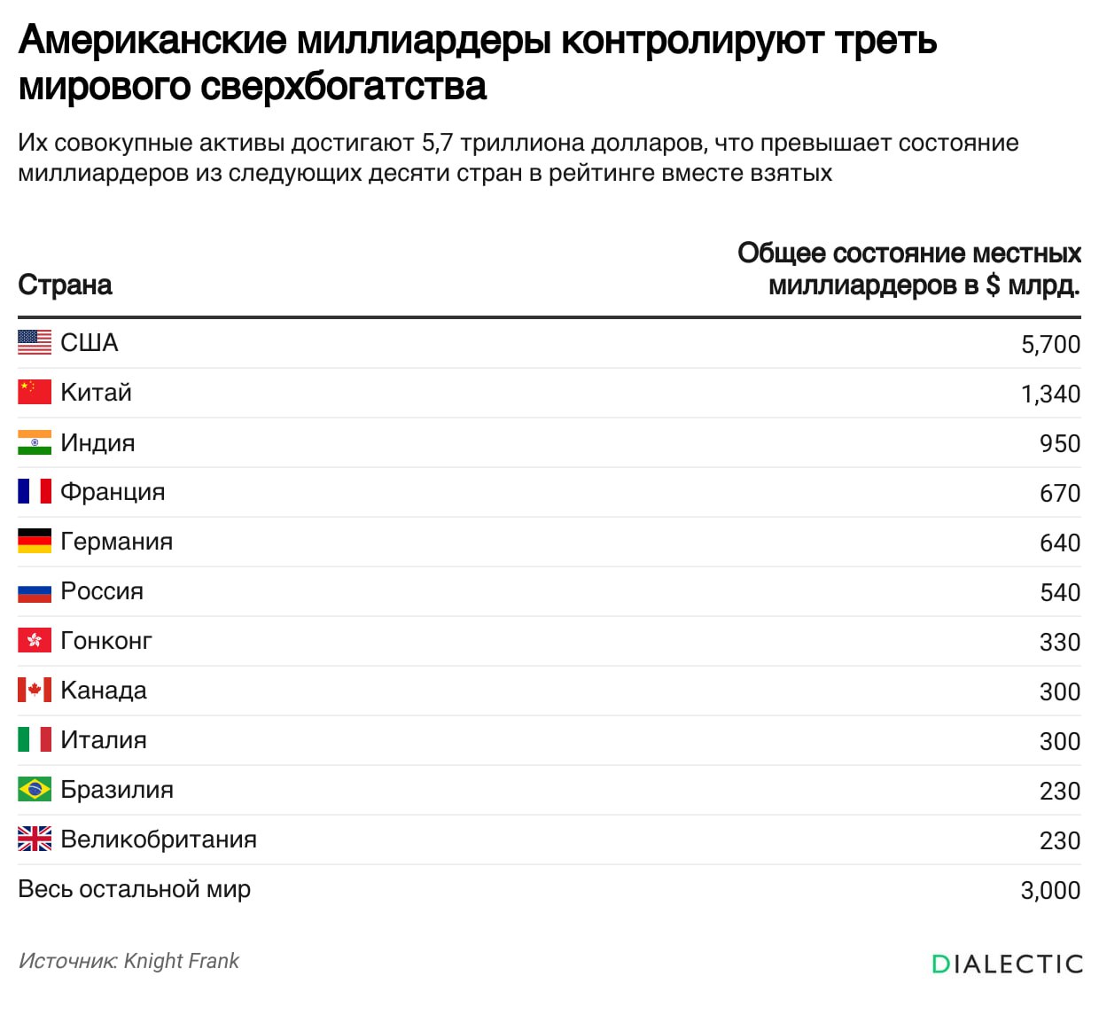 Согласно данным отчета Knight Frank, американские миллиардеры контролируют наибольшую долю мирового богатства — их совокупные активы достигают 5,7 триллиона долларов, что превышает состояние миллиардеров из следующих десяти стран в рейтинге вместе взятых.