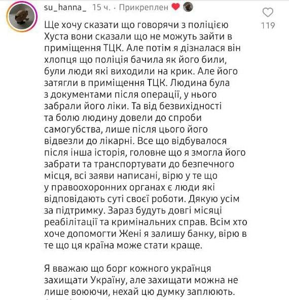 Після чого хлопця доставили до ТЦК міста Хуст, де його били доти, доки він не вирішив покінчити життя самогубством, тільки після цього хлопця відвезли до реанімації, пише дівчина. Ряд пабліків вважають, що це той випадок спроби самогубства, про який повідомив ТЦК Хуста.