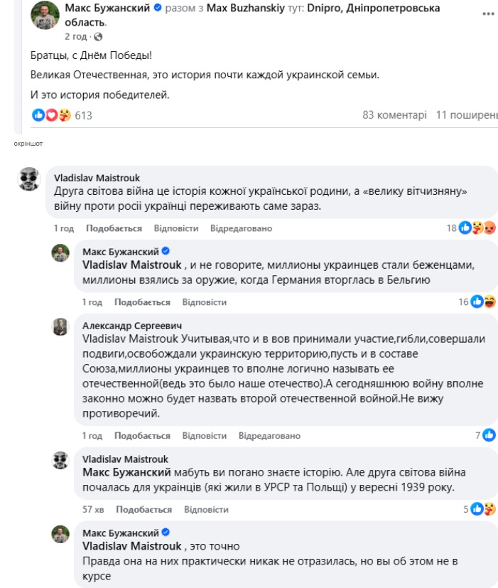 «Братці, з Днем Перемоги! Велика Вітчизняна, це історія майже кожної української родини. І це історія переможців», – написав Бужанський.