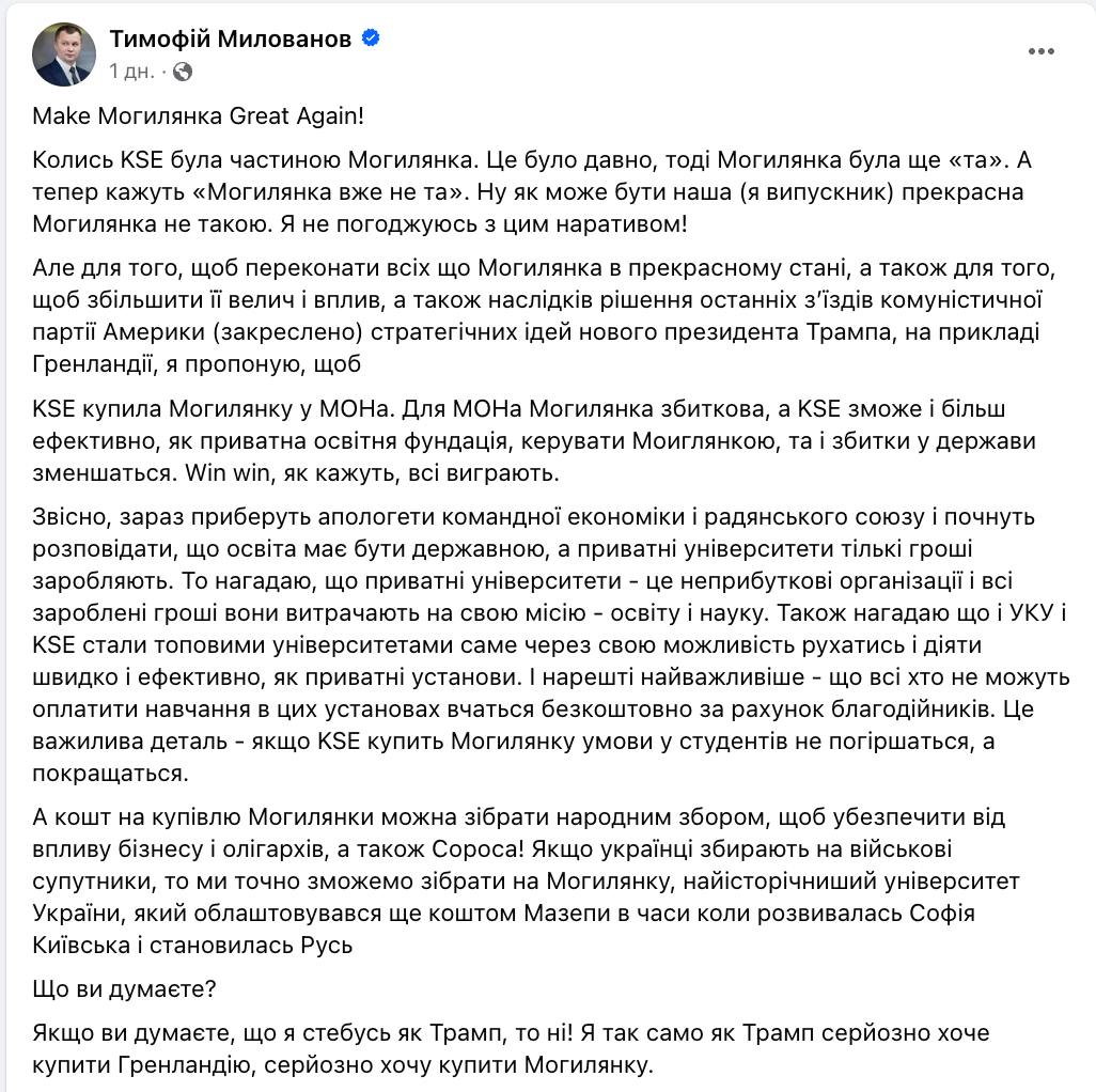 Екс-міністр економіки Тимофій Мілованов заявив про бажання "купити Києво-Могилянську академію народним збором - "за прикладом Трампа, який хоче купити Гренландію".Про це вн написав в соцмережі.