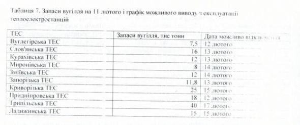 По словам источника, до конца дня воскресенья угля хватило на Углегорской, Приднепровской ТЭС. На Славянской, Кураховской, Запорожской запасы угля иссякнут в понедельник вечером. На Мироновской, Змиевской — до конца дня вторника, на остальных ТЭС, кроме Трипольской, до конца дня среды. Трипольская ТЭС, обеспечивающая электроэнергией Киевскую область, может остановиться в следующую пятницу.