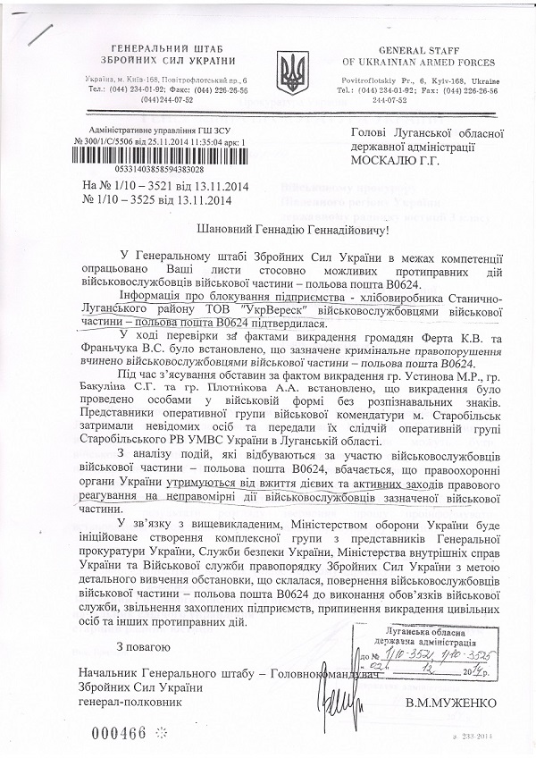 Так, в ответе Муженко указано: «Информация о блокировании предприятия - хлебопроизводителя Станично-Луганского района ООО «УкрВереск»военнослужащими воинской части - полевая почта В0624 подтвердилась».