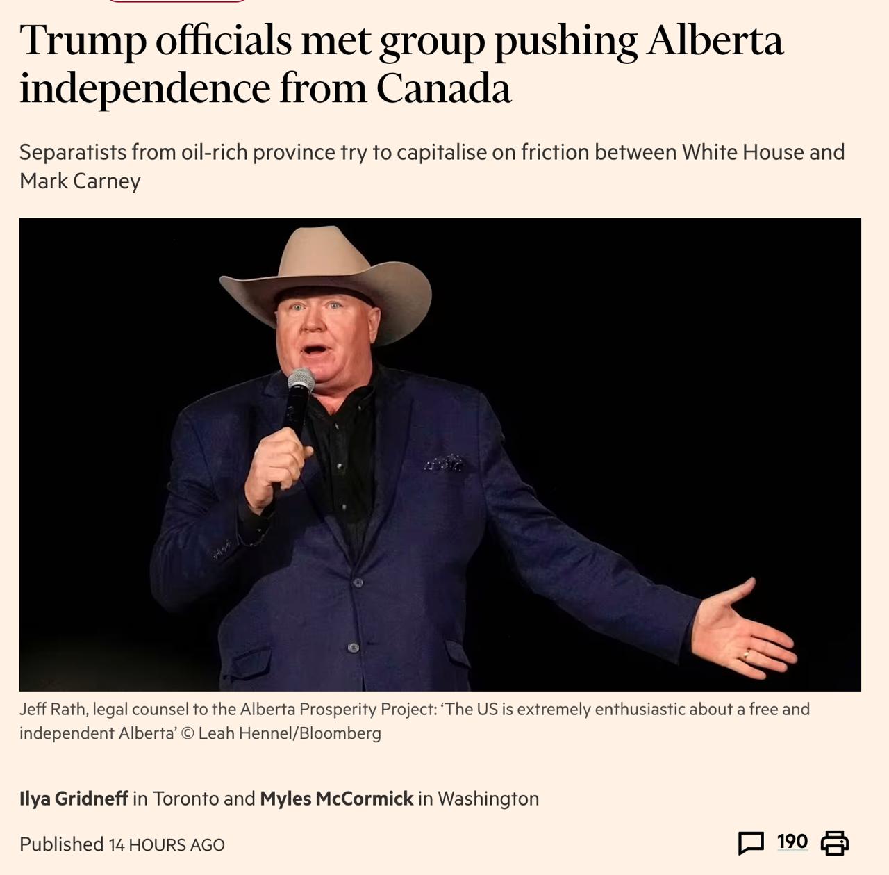 Цим скористалися праві політики КАнади -лідери «Проекту процвітання Альберти», група правих сепаратистів вже тричі зустрічалися з представниками Держдепу США у Вашингтоні з квітня минулого року.