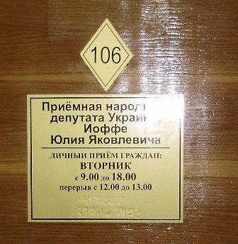 Попытка отыскать общественные приемные народных депутатов в соседних округах - в городах Северодонецке и Рубежном – увенчалась успехом лишь в отношении народного депутата Украины Юлия Иоффе. - в здании Рубежанской мэрии без труда нашли кабинет №106 с табличкой, на которой было имя нардепа.