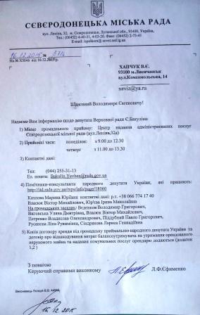 ФОТО. Ответ на информационный запрос журналиста В.Хапчука от 16.12.2015г. из Северодонецкой мэрии о договоре аренды для общественной приемной народного депутата Украины Евгения Бакулина.