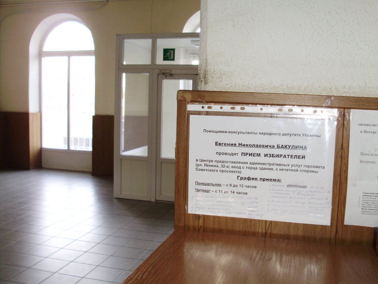 В поиске приемной народного депутата Украины Евгения Бакулина журналисту пришлось немного попотеть. После запроса в Северодонецкую мэрию мы получили информацию, что его приемная находится по адресу: г. Северодонецк, ул.Ленина, 32 каб.17 (общей площадью 14,2 м.кв. – в здании административного центра).