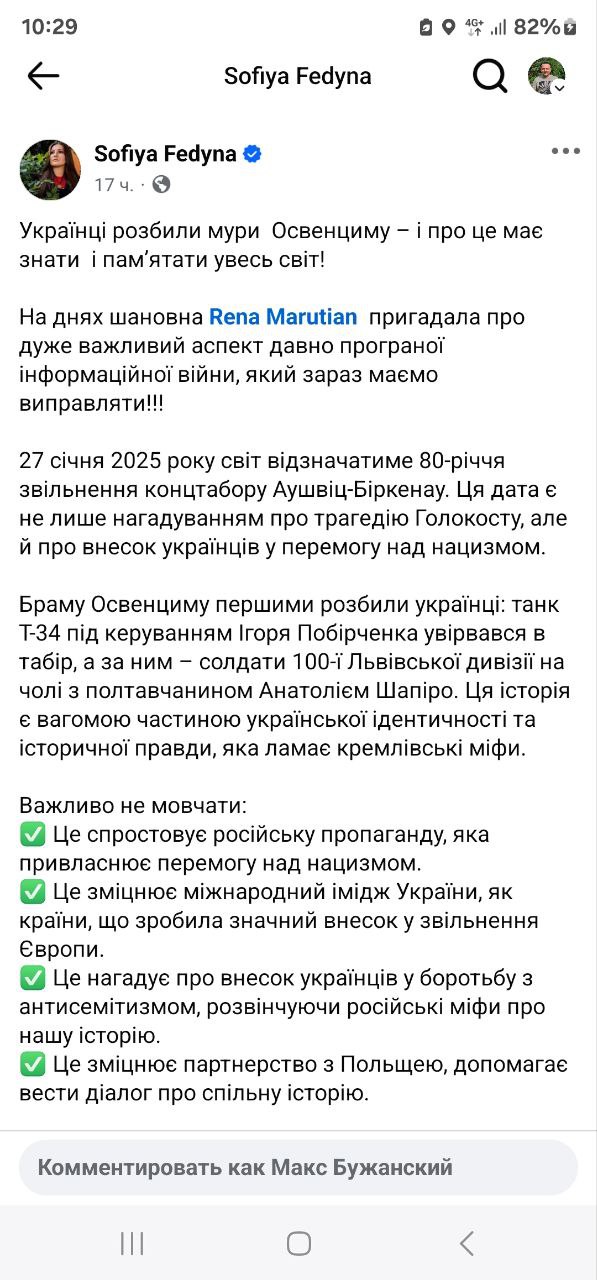 Депутатка від "Євросолідарності " Софія Федина пригадала про "дуже важливий аспект програної інформаційної війни, що треба виправляти" - необхідність святкувати 80-річчя звільнення в'язнів Освенциму.