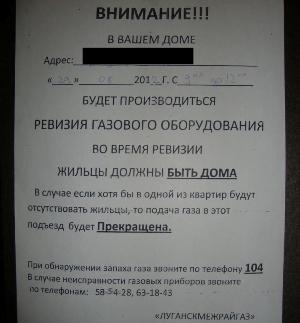 «Возвращаюсь я сегодня домой с работы. А на подъезде висит вот такое объявление. А в объявлении безапелляционный ультиматум, который гласит, что представители Горгаза собираются прийти в своё рабочее время с какой-то там ревизией в наш подъезд и при этом мы просто обязаны ВСЕ быть дома в наше рабочее время иначе зима для нас будет не просто холодной, а пиз**ц какой холодной. Возникает вопрос: а с какого х*я мне какая-то организация указывает где мне быть в СВОЁ рабочее время в течении целых трёх часов, отсутствие которых в рабочем графике приравнивается в соответствии с КЗоТом как прогул? Хотите сделать ревизию? Да, пожалуйста, но только в то время, которое устроит большинство жильцов подъезда. А это по большому счёту либо вечер, либо выходной день. Извините, что не все слова литературные, но на сегодня это стало последней каплей», – сообщает луганчанин Алексей Емельянов.