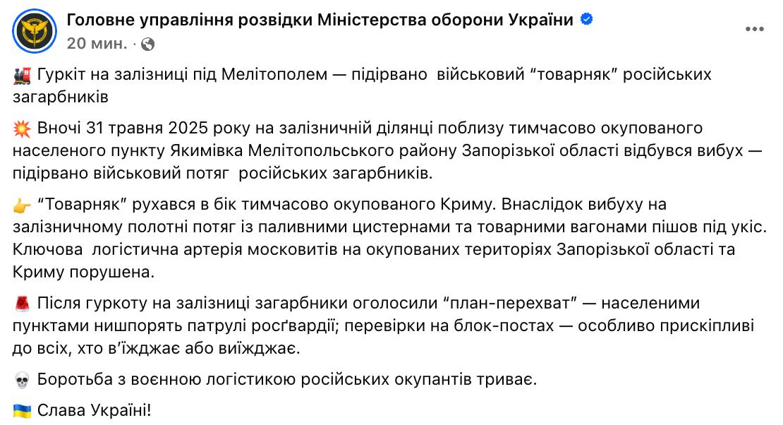 ▪️31 мая 2025 года в 22 часа 50 минут на железнодорожном перегоне Выгоничи — Пильшино в Брянской области в результате подрыва произошло обрушение конструкции автомобильного моста, обломки которого упали на проходивший под ним пассажирский поезд;