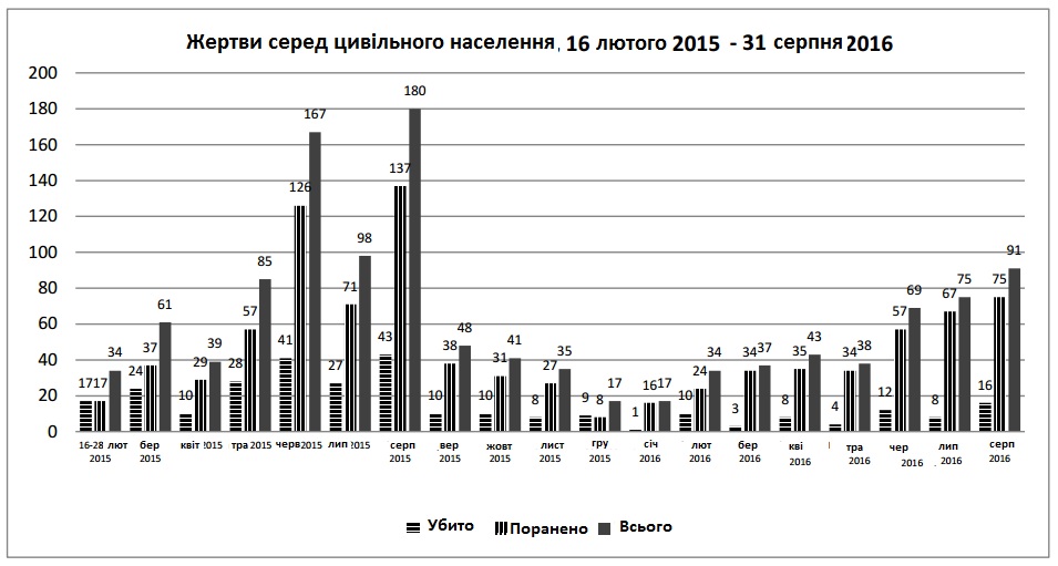 16 цивільних убито, 75 травмовано під час обстрілів, через міни та стрілецьку зброю у серпні на Донбасі. Про це повідомляє Управління ООН з координації гуманітарних питань ( OCHA).