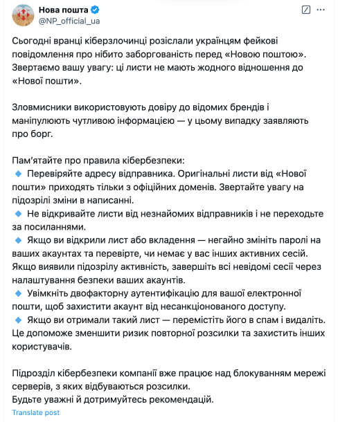 Нова шахрайська схема: злодії надсилають українцям фейкові повідомлення про нібито заборгованість перед «Новою поштою» і просять погасити її за новими реквізитами, погрожуючи судом