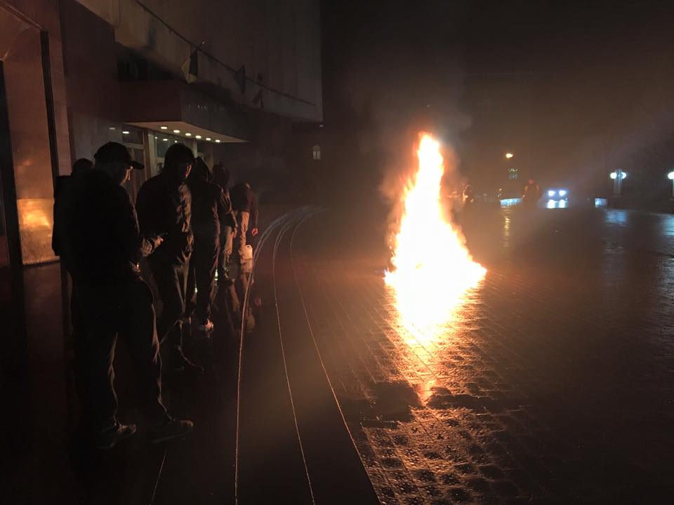 Майже одразу під будівлю прибули три машини пожежної служби. Мітингувальники не дали загасити полум’я – натомість поїхали по нові шини для вогню, повідомив “Галці” Мерінов.
